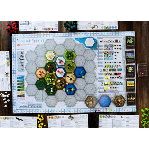 Through wily action pawn placement, players will strive to become dominant on as many different terrain tiles as possible in order to claim powerful card effects. Players will also want to propagate their individual species in order to earn victory points for their particular animal. Players will be aided in these endeavors via speciation, migration, and adaptation actions, among others.