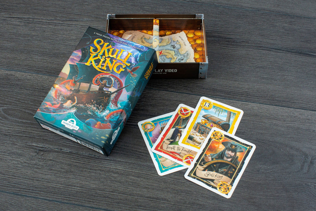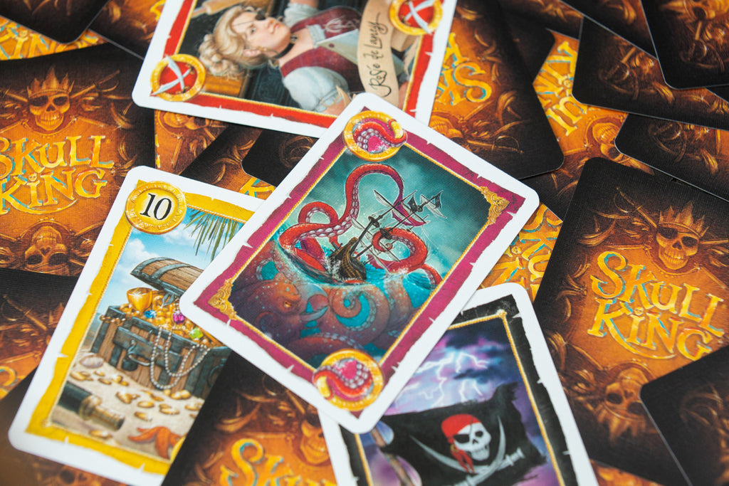 Skull King is a trick-taking game similar to 'Oh Hell!', 'Wizard', 'Eucher' and 'Spades', with players needing to state how many tricks they think they'll win each round. A unique element of this game is that bidding takes place simultaneously, leading to rounds that are sometimes over, or under-bid. As players must win the exact number of tricks that they bid to earn points, winning too many tricks is just as bad as winning too few and this leads to intense competition where losing a trick can be as exciting as winning one.