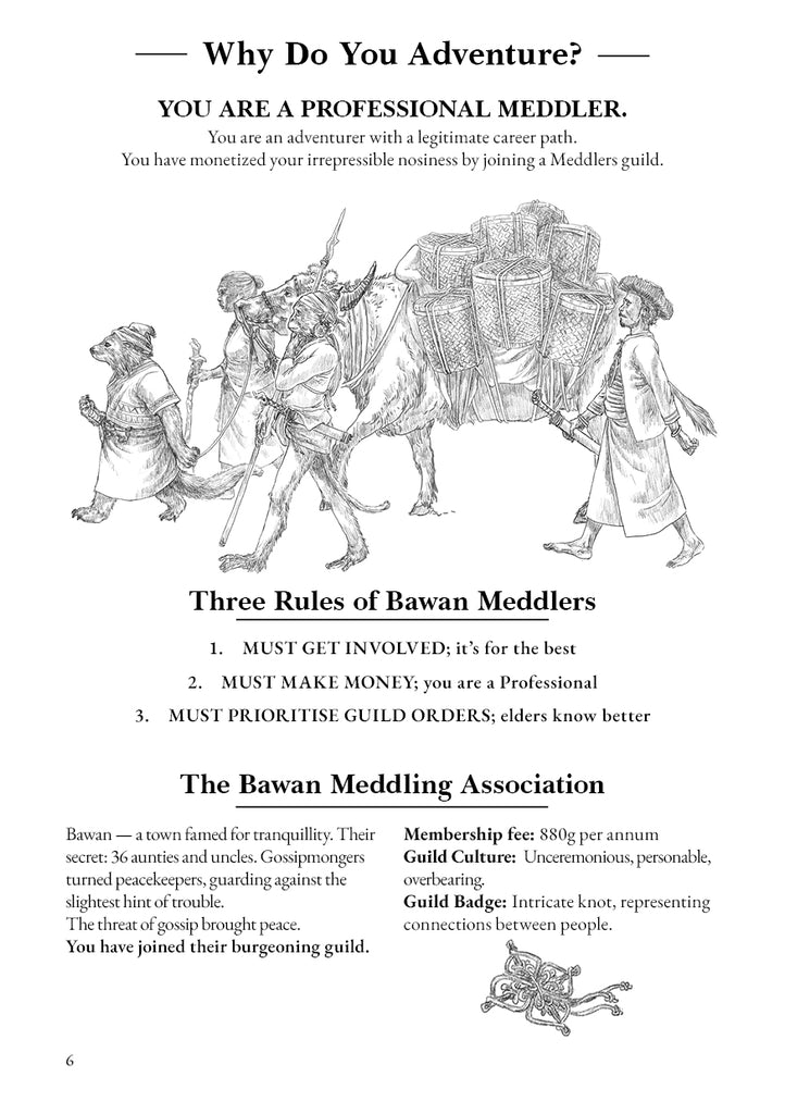 Meddling as adventuring: Join a Meddling guild! Fulfill your irrepressible nosiness, monetize your busybodyness. You might even help people along the way.