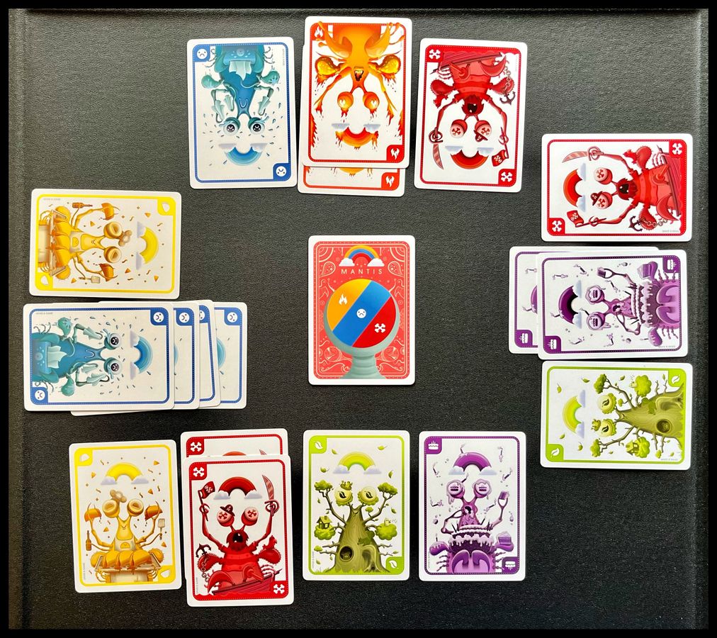 MANTIS has only two rules: Steal or Score your way to victory. Collect matching cards by stealing or scoring until the winner has 10 cards in their score pile.