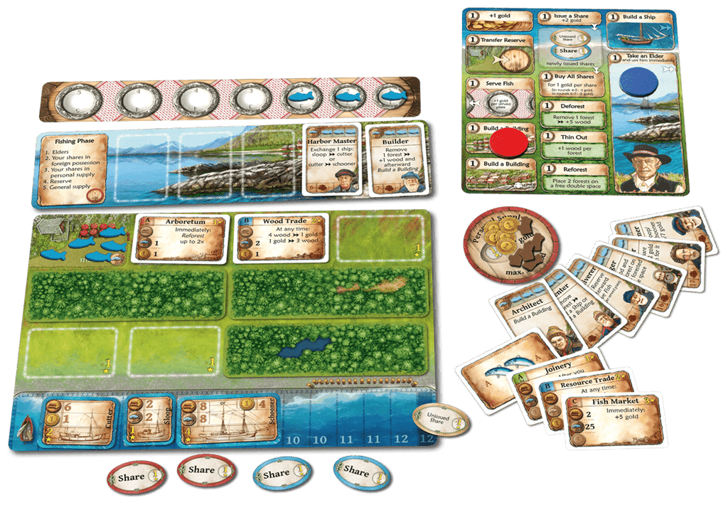 As with Agricola and Ora et Labora, Nusfjord has a worker placement mechanism, with each player starting with three workers that they place on a central board to trigger certain actions. Whether a player wants to clear a forest on their own board, buy a new cutter, or construct a building, they must place a worker on the appropriate space — which is possible only if room is available for this worker. Money is scarce, and one of the quicker and easier ways to get it is to place shares of your own company on the market. This risky action could be worthwhile because if you succeed in buying these shares yourself, you have usually won money and not suffered any disadvantages; however, if an opponent acquires these shares, then you must allow them to benefit from your hard-earned catches at sea. The village elders might want their own share of your catch as well, especially if you've visited them to take certain actions in the village, so if you don't take care, your catch could end up entirely in the hands of others and your camp will be empty.
